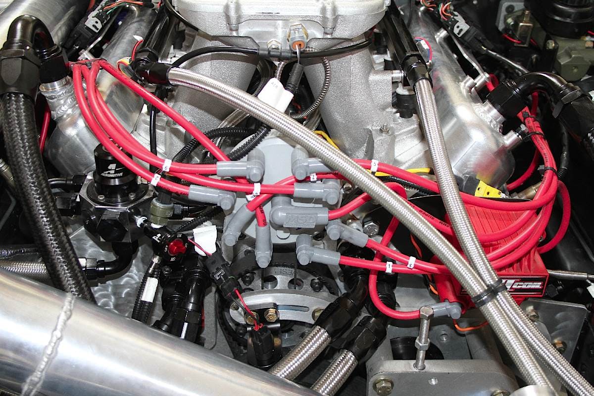 Our pump, an Aeromotive EFI Pro Series unit, is designed for and can easily handle as much as 1,700 horsepower in a forced induction EFI engine and a staggering 2,600 horsepower in a naturally aspirated, carbureted motor. With almost double the flow capabilities of Aeromotive’s famous A1000 pump, this thing is killer and more than enough to accommodate our needs. In addition to the pump, we’re utilizing Aeromotive’s EFI Pro Series Fuel Pressure Regulator and EFI Pro Series fuel filters. The VP Racing Fuels C16 fuel is fed through Fragola’s 3000 Series race hose and fittings from a custom-built two gallon fuel cell to Holley LS fuel rails for our Hi-Ram intake outfitted with FAST 160-pound fuel injectors.