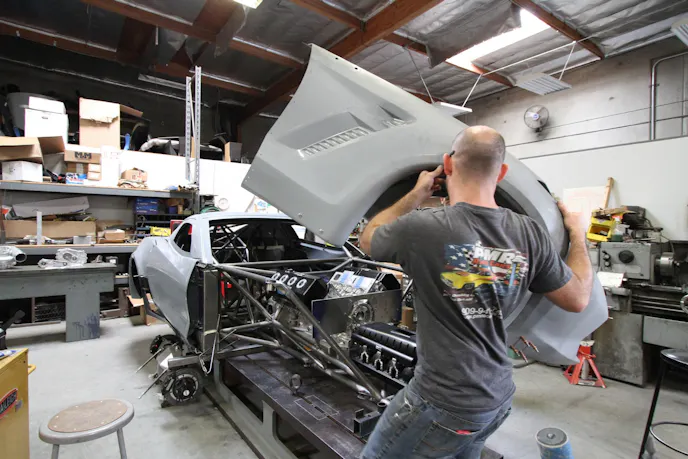 With the engine in place, it was time to get the fenders and hood on the Corvette. Since moving it wasn’t an option, when there were some clearance issues PMR had to get creative in getting the hood to fit while still looking as close to factory as possible.