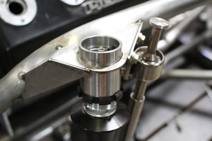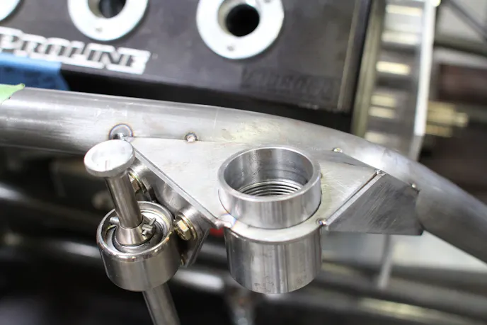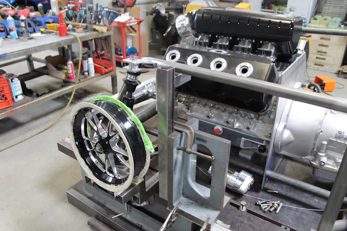 After the mockup procedures for these components were complete,, Mandella was able to begin the process of getting the front end placed in the correct location and check the dimensions. That allowed him to figure out where the front tire placement would need to be, then where the strut would go, followed by the upper strut and A-arm.