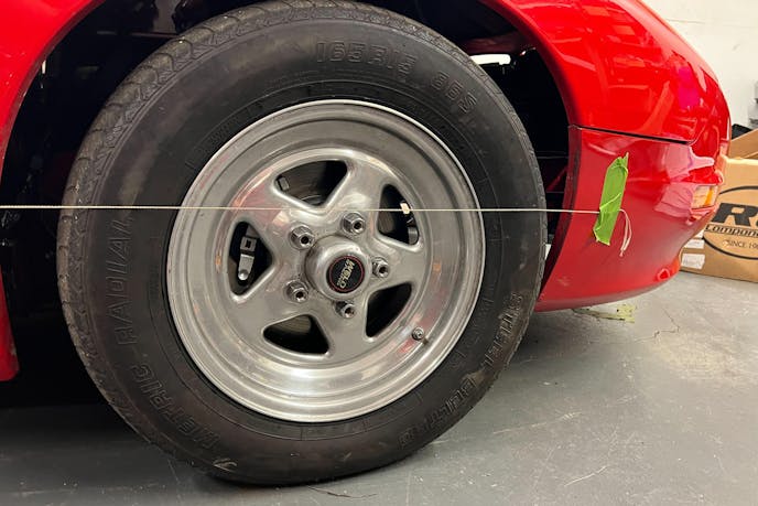 With a unibody or factory frame car like our Project Number Cruncher, the frame itself is not always a reliable indicator of the point of center — the frame could have been designed unsymmetrical side to side, or could be kinked from age or accidents. So a great and simple way to do this is to run a string from the centerline of the front wheels, to the center of the rear, on both sides of the car; if the measurements line up, then the front wheels are straight in relation to the rear axle, and the car should drive straight.