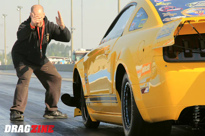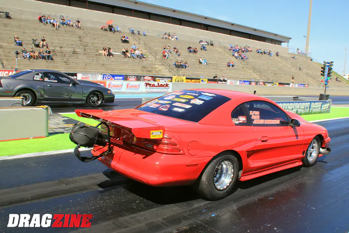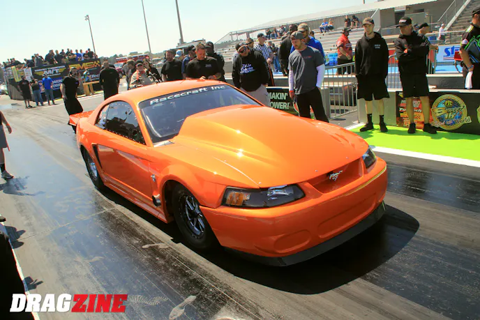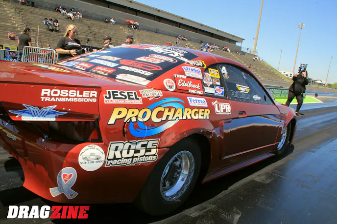 “We crossed our fingers and put something in it and hoped for the best,” said Brad Edwards of his 3.731-second pass last night. It was a mighty feat for his still factory-style suspended, old-school Mustang. A .982 60-foot and 2.502 to the 330 mark and just 199 mph at the stripe. “We’re not running it out the back yet … not pushing the tune up. It might, might, if it keeps going A to B, run a .60. It’s a non lock-up, stock suspension, factory floor boards, all the good fun stuff.”