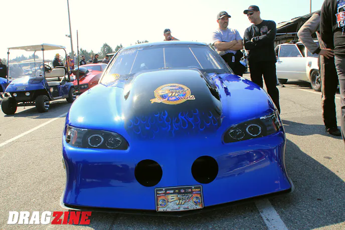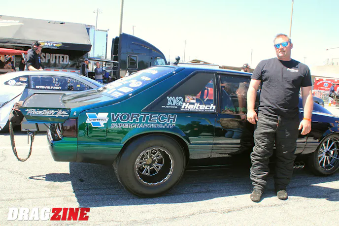Ken Quartuccio is qualified mid pack after running a 4.66 at 213 today and has gone quicker every round. He is also driving Manny Buginga’s new X275 car and with only a few runs on that he sits on the bump spot with a 4.356. This is Ken’s first time behind the wheel of a Mustang and he fit right in there and is running well. The Mustang is a ProCharger combo out of ProLine Racing, with Jamie Miller assisting with the tune-up. “We’ve made three runs on this car since it’s been out with a new combination: a .50, a .41, and the .35 a little while ago,” Ken told us. “We went a .68 last night and a .66 this morning, so we are going to sit out a couple of rounds this afternoon and prepare for the night sessions. Jamie is hoping for a .63 or .64. I’m pretty excited, we didn’t even think we were going to qualify for the Sweet 16 to be honest with you, so to be able to get it to go as good as he’s gotten it to run, hats off to him. We came to Lights Out with a package we thought would be competitive and it wasn’t so Jamie got with Mark Micke and Pro Torque and changed some things around in the converter and with the gearing in the transmission and Justin Carmack sent us some different rear gears to test. I couldn’t be happier.”