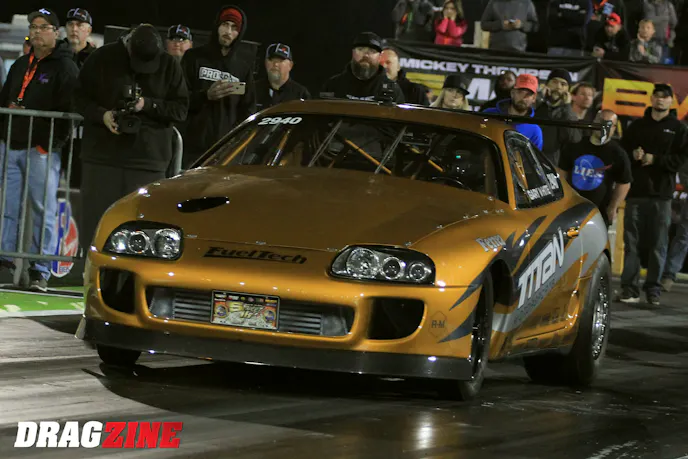Gary White is driving the Titan Motorsports Supra this weekend and is currently sitting in thirteenth with his 4.34 at 172. The combo uses a 2JZ Toyota engine base and Precision 88 millimeter turbo with a billet block from Expert in Brazil topped with a factory cast head prepped by Titan and backed by a Liberty five speed and Easy Motorsport four disc seven inch clutch set up. Yes you read that right, clutch. Most people say clutches and radials don’t work but they are out to prove that idea wrong and are doing a good job of that. “ A few year ago we were at a bar over seas with some of the top radial guys and we had several conversations revolving around clutch cars and radials and whether or not it would work..” said Gary. “We kinda thought it would and Nero, the owner of Titan, stepped up and here we are running the car again with a clutch in X275 and here we are.” Gary was skeptical but last June they tested in Orlando with good results and some solid runs proving the concept. They ran the car in Australia, then at World Cup going a 6.85 at 219 there. The team raced at TX2K and struggled a bit before coming here. “Anderson Dick from Fuel Tech has been a great help and we have Eric Luzinski, who has been tuning with me for years tuning this car as well.”