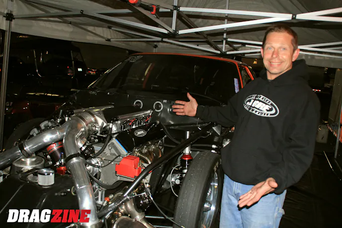 Marty Stinnett had a great day after starting out on the bump with a 3.989 at 146 then jumping in with a 3.694 at 204 in the second session with the little small-block that could. Stinnett uses a Jeff Burns engine with Garrett turbos tuned by Wade Hopkins from Southern Speed Racing. After a disappointing performance at Lights Out 10 Marty and Wade went back home and regrouped, checked the whole car over front to back and put it back on the scales.