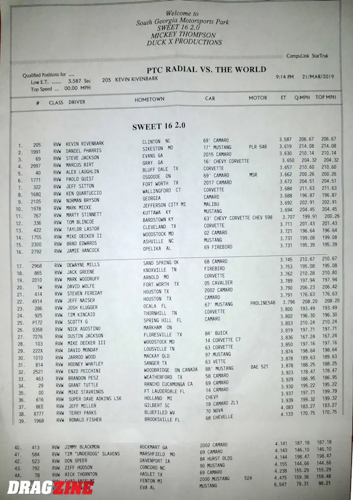 We could not have asked for better weather this week here in Georgia to have this amazing event with records smashed and simply stellar performances from many of the racers this weekend. Looking over the sheets even down to thirty two cars in Radial vs The World we find Scotty G’s ‘G Unit’ with a 3.80 at 196 and in X275 we see Kenny Rodriguez sitting with a 4.42 at 149. Round one will be off the chain here shortly as the racers fight hard for the win and earn bragging rights as the Sweet 16 2.0 winner. Oh and the money, though for many that is certainly a secondary concern to the prestige of victory in such a competitive environment.