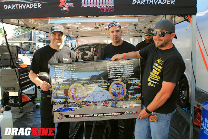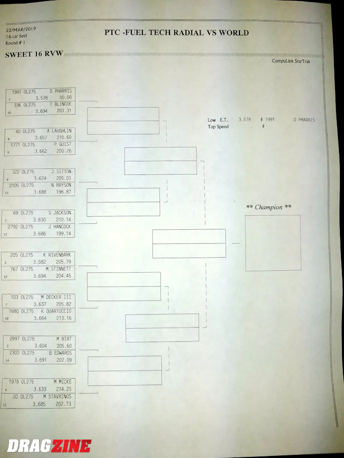 Daniel Pharris scored top qualifier in Radial vs the World, resting on his Friday morning numbers to seal it up. The team suffered engine damage this afternoon, losing a lifter on a run, forcing the team to swap in a new engine and miss time on the track. Pharris earned runner up against Alex Laughlin at Lights Out 10 and they knew coming into this Sweet 16 deal a 3.67 is not gonna cut it. “ We found some stuff that we knew would pick the car up..” Daniel said. “We tested before coming here and found a few more things we could try and try more of it. We tried some things with power management and suspension and the car really, really liked it.” The team has focused on the front half and they almost a tenth faster than than they ran before with the split numbers. “We knew what the tune up needed to be to make the car run, to go that fast, what we needed to do was to figure out how to make the car take the tune up.” T Daniel and the team are confident going into eliminations Saturday feeling like they have the car to beat tomorrow. Time will tell the story and it will be one hell of a story to tell when it all shakes out.