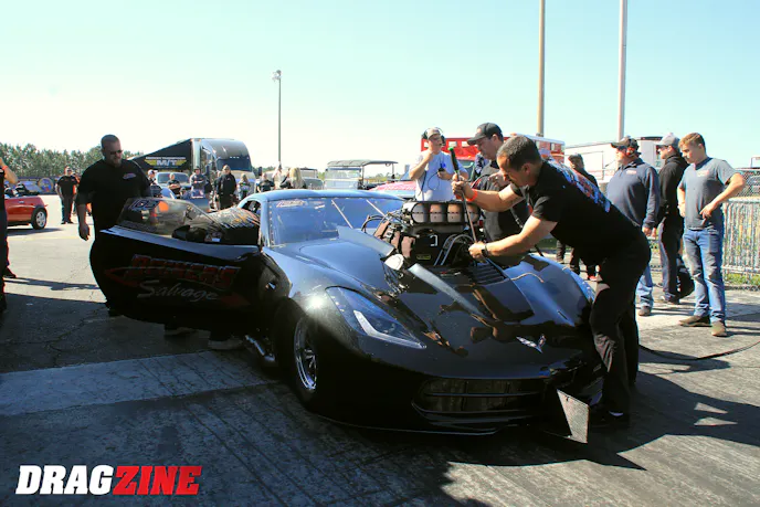 Macon, Georgia’s Marcus Birt recently teamed up with Steve Jackson and Phil Shuler to go radial racing in the Houston Auto Auction-sponsored, Jerry Bickel-built Corvette and two races in they have the nitrous record after running a 3.650 at 204 in the fourth round of today’s qualifying. Marcus ran Pro Mod and Outlaw 10.5 back in the day and ran ran Pro Mod with NMCA in 2018 and the SNRA in 2017, winning the championship in that series. “ I think we got a little more in it, maybe a .62 … we’re happy so far for sure,” Birt told us. “I have to thank Houston Auto Auction owns the car — we definitely couldn’t do this without them. Craig Amerson and Eddie Wilson have been with me over 10 years on the crew. Thanks also to Jeffery Barker, he’s the guy that put this together with me and Stevie. I hope we continue it and see what happens down the road.” Their plan tomorrow is to run close to the .65 or a little quicker depending on track conditions in the morning then sit back and crunch some data and tune it for the later session and run it hard to see what she’s got.