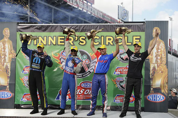 Antron Brown (Top Fuel), Vincent Nobile (Pro Stock) and Hector Arana Jr. (Pro Stock Motorcycle) also were winners at the NHRA Mello Yello Drag Racing Series event at Route 66 Raceway.