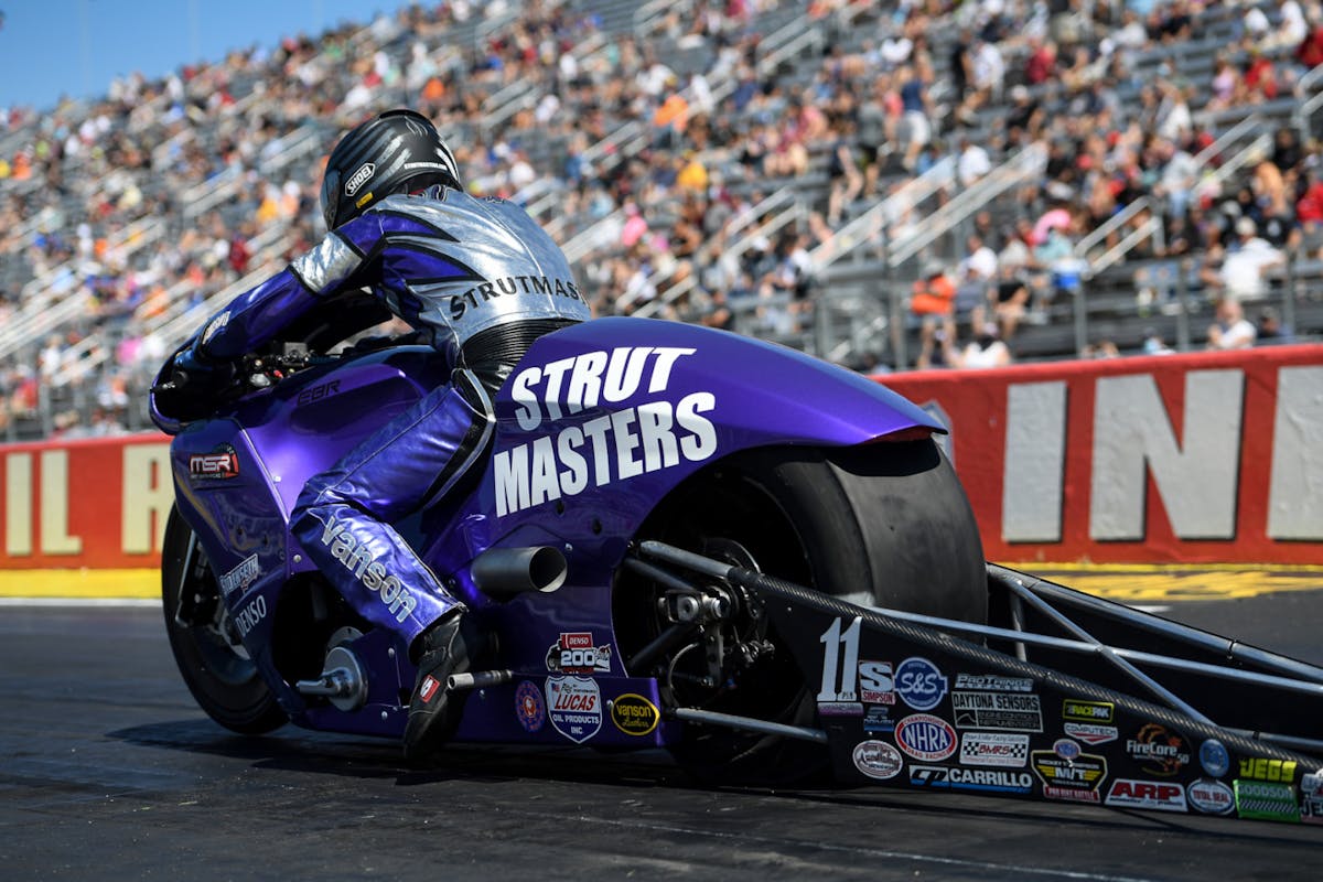 Pollacheck suffered the red light in the Mickey Thompson Pro Bike Battle, but he did take the No. 1 qualifier in Pro Stock Motorcycle with his run of 6.789 at 200.29, breaking the track speed record on his Strutmasters.com EBR. It gives Pollacheck his second career No. 1 qualifier and he will face Michael Phillips to open raceday. Eddie Krawiec qualified second with a 6.790 at 199.76 and Smith took the third spot with a 6.792 at 199.76.