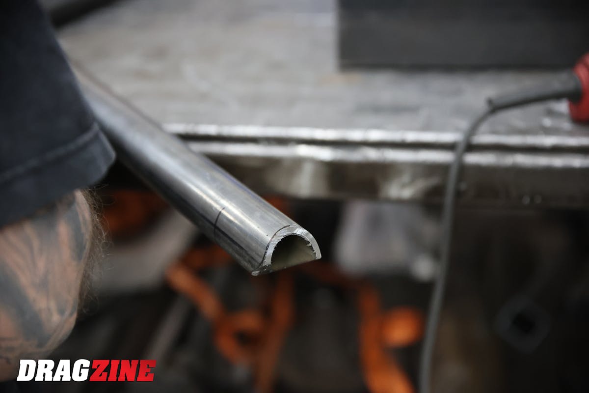 “The first thing you want to do is make sure you get the correct profile of the notch. I like to use some scrap tubing to get the notch how I want it. I’ll use a paper transfer to get the notch I’ve created onto the tube I’m using for the roll cage. I like to leave some extra material on the notch so that when I’m using the angle grinder to finalize it, I have the ability to sneak up on it without taking too much material off right away,” Burton explains.