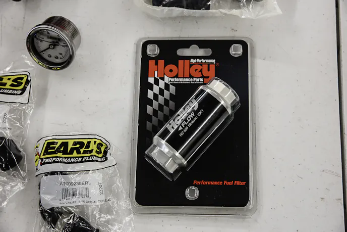 “As with the regulator, the bigger the fuel pump is, the bigger the filter should be. You don’t want to pair a huge pump with a tiny filter, because the filter will end up choking the flow. And if you’re using E85, you should also verify that the filter you’re planning to use is compatible with that fuel. If you have an in-line pump that’s not in the tank, you’re going to want a 100-micron pre-filter before the pump and a 10-micron filter after the pump, no matter what. If you have an in-tank pump, the filter sock on the pump functions as the pre-filter,” Flynn states.