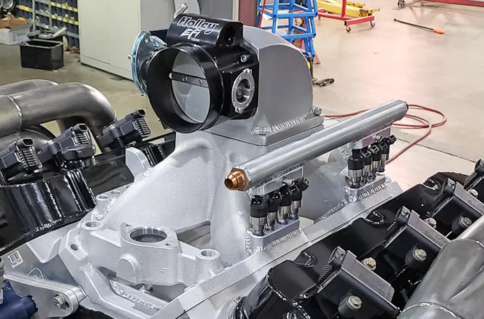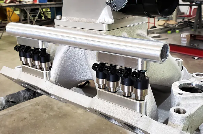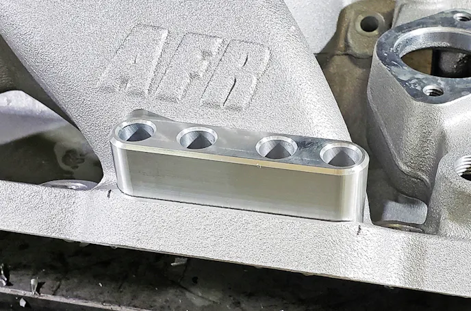 “We knew we were going to push the head material when we modified them for 1/2-inch diameter pushrods,” Taylor described. “On the Magnum 18 intake manifold, we also highly modified the carb flange and plenum area for our 90-degree turbo inlet and added provisions for 16 Holley Performance 160 lb/hr fuel injectors. The material is there on the AFR stuff do all of the modifications we wanted to do.”
