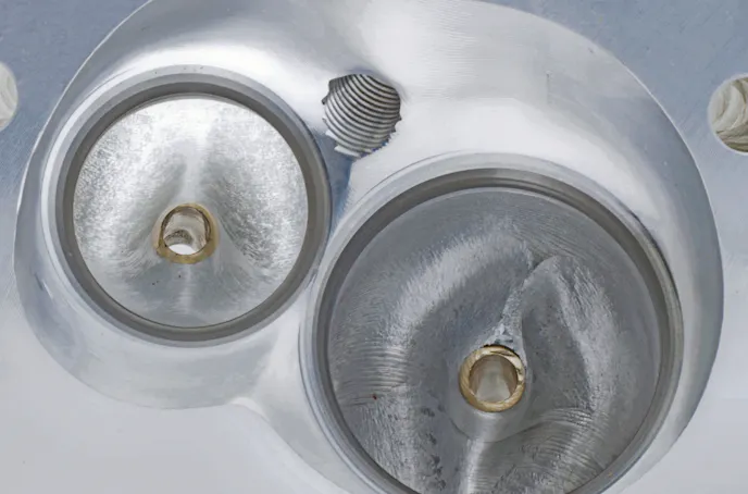 “Many performance head designs flatten this valve angle to 24-degrees,” says Chris Sperling, Director of Engineering and Technology at AFR, who took the alteration even further to 18 degrees. ”This angle change fundamentally improves airflow, horsepower, and torque. There are a lot of modifications in the chamber design on top of the rolled valve angle. Even the exhaust valve angle is rolled just a little bit more.”