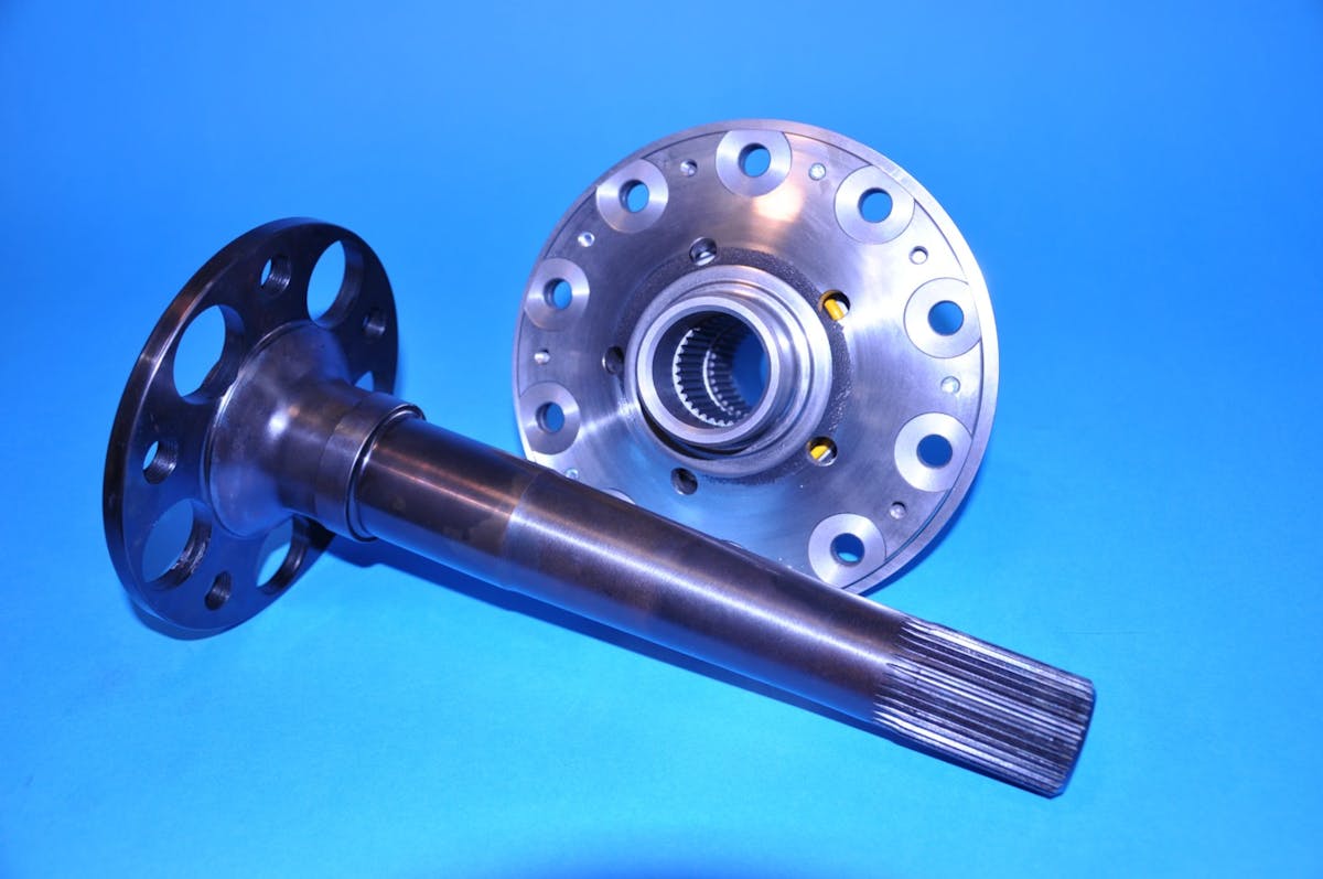 OE carbon steel axles (typically SAE 1055 or 1541) are induction-hardened only up to the bearing surface, leaving the flange much softer than the rest of the shaft — that’s so people can run into curbs or potholes and not snap the flange off, or so the story goes. Induction hardening (shaft passes through an electromagnetic coil that excites a powerful current within the shaft, thereby heating it) penetrates about 0.150- to 0.300-inch, so the axle core remains relatively soft. Typically, the shaft surface hardness is 55-58 Rockwell and is very brittle — this is great for curb-bangers, but certainly not capable of handling the shock loads associated with massive torque.