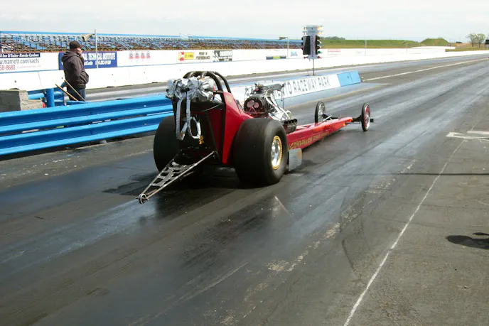 Walker reports that racing slicks that are take-offs from recent racecars are used for dragging. Occasionally new ‘blems’ are available that work best. He avoids tires approaching a year old, as they are too dried up for dragging.