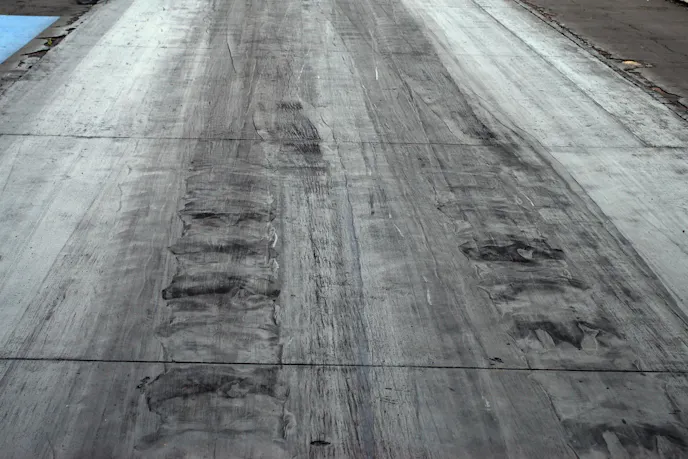Paul Bradner is an expert who worked drag racing track preparation for decades. He agrees that concrete, which is common on starting lines, is porous and absorbs more moisture from the air than pavement. Sunlight will heat the surface. Rubber will accumulate from burnouts and multiple launches from powerful racecars. Bradner says water will emerge from concrete under the rubber, breaking the bond between the rubber coating and the track. The surface rubber will pull off in chunks.