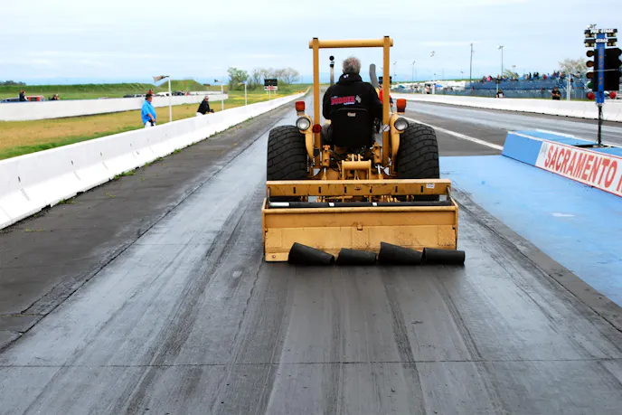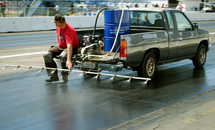 Spraying surface treatment onto the racetrack prior to dragging in preparation for high powered drag racecars