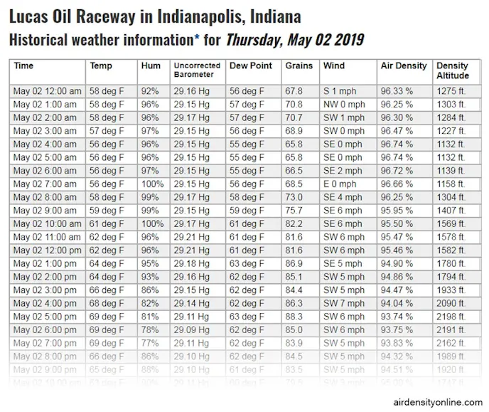 Hourly air density weather for Lucas Oil Raceway, Indianapolis, IN, for May 2, 2019. The early morning temperature was around 60-degrees Fahrenheit while the dew point was close. At that point, humidity condenses out and coats a racetrack surface even if it is not currently raining.