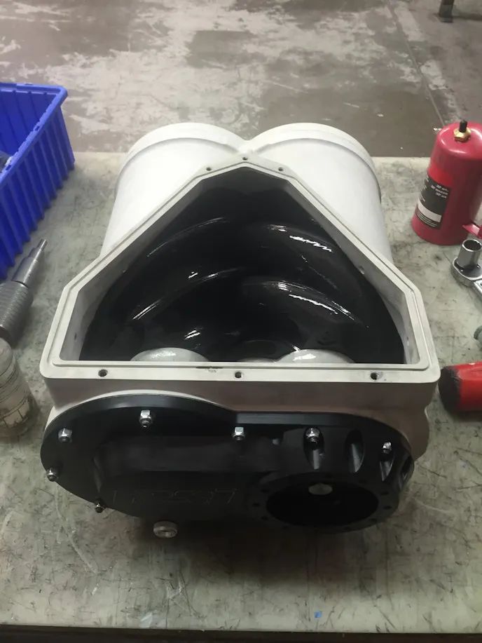 The screw blower may look similar to a roots blower, however, it functions differently. The roots blower acts like a pump for the air as it goes into the motor, whereas the screw blower is more like an air compressor in how it forces the atmosphere into the engine.