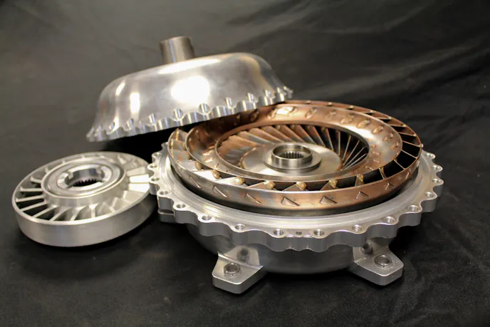 “The NXS is a converter that has a split blade pump impeller. What that means is on the vacuum side, or low-pressure side of the pump impeller, we’ve intentionally weakened it by shortening every other blade. What that does is it weakens the initial coupling force of the converter so that at the shock load it spikes slippage into the converter, which allows us to throw power at it and control the tire by initially slipping the converter momentarily. To compensate for that we’ve put more blades on the high-pressure side. For example, a normal converter would have around 30 blades on the pump impeller, an NXS has 40 blades on the high-pressure side,” Chance explains.