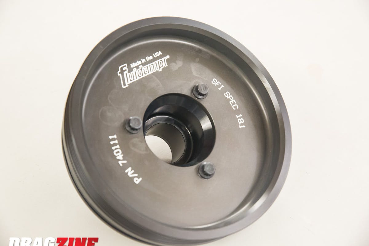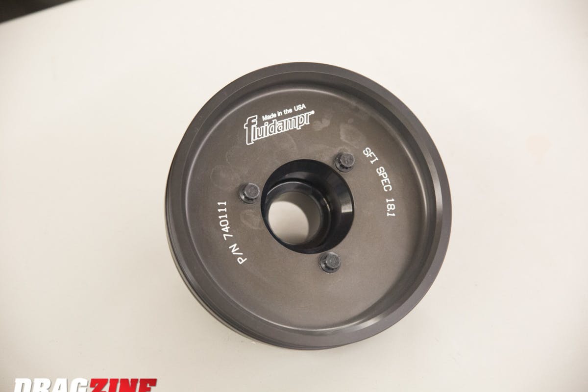 “An organization will get random dampers through a vendor or other unknown source so they can test the durability and integrity of the product. This is done by tests at 12,500 rpm for long durations to see if the dampers can deal with the stress of a high-performance engine. The NHRA and other racing sanctions require a safety standard from SFI; the certification is 18.1 which pertains to harmonic dampers/balancers. Fluidampr performance dampers are all SFI: 18.1 spec certified,” Orefice explains.