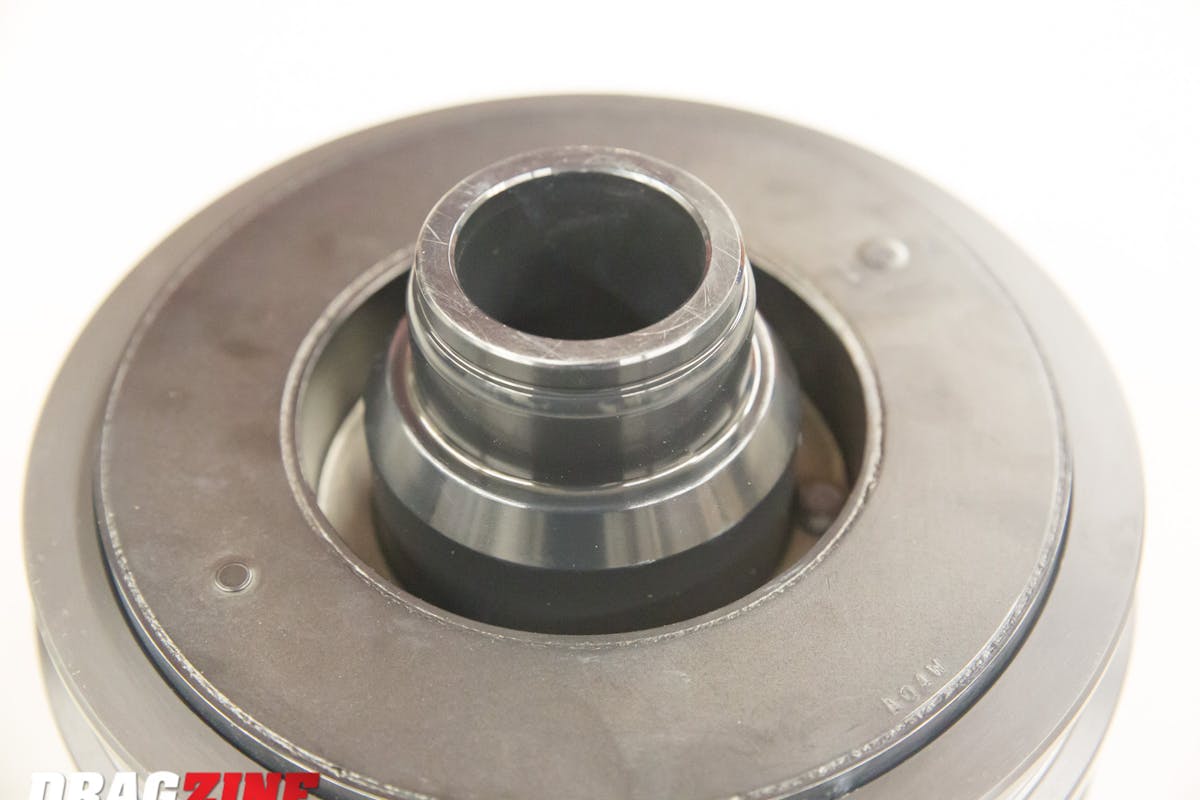 “Any power adders like turbos increase torque, and therefore also increase the torsional vibration amplitude on the crankshaft. The stock elastomer-style damper will wear out faster from the additional heat created from the torsional harmonics. This will cause the rubber bonded material to weaken over a shorter period of time and could allow the inertia ring to fly off while the engine is running,” Orefice says.