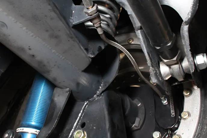As with every car since the beginning of time, you’ve gotta’ have brakes, plain and simple. Even with a parachute to scrub off the big speed, you still need binders on the axles to bring the thing to a stop, or at least slowed enough for the turnout and return road. In a drag race situation, where weight is the enemy of performance, you want the lightest brakes that will still stop the car. The heavier the car, the bigger and thicker the brakes need to be.