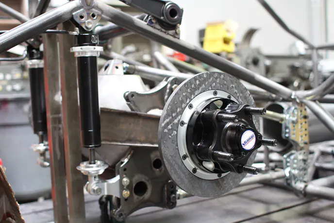 Starting at the front of the car, the Strange C4600WC is designed to be used with Anglia spindle-mount wheels. Carbon fiber rotors measuring 10-inches in diameter are fitted with billet aluminum hats and retaining rings. The clamping force is provided by a single 1.75-inch piston inside a billet aluminum caliper. Inside those calipers are carbon fiber brake pads.