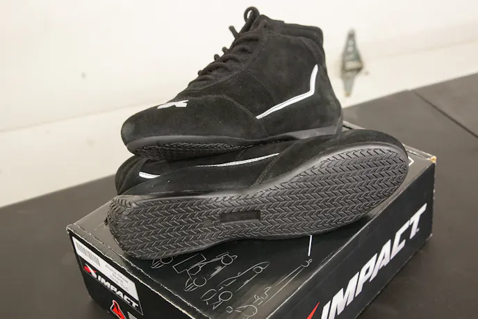 If you’re going to play the stripe in bracket racing you want a shoe that’s going to give you the most accurate throttle pedal feel possible. With that in mind, we tried on a few different shoes and Impact’s Alpha felt the most natural, so we picked up a pair. The nice thing about these shoes is they really feel like a normal sneaker, so there’s no adjustment period needed when you put them on.