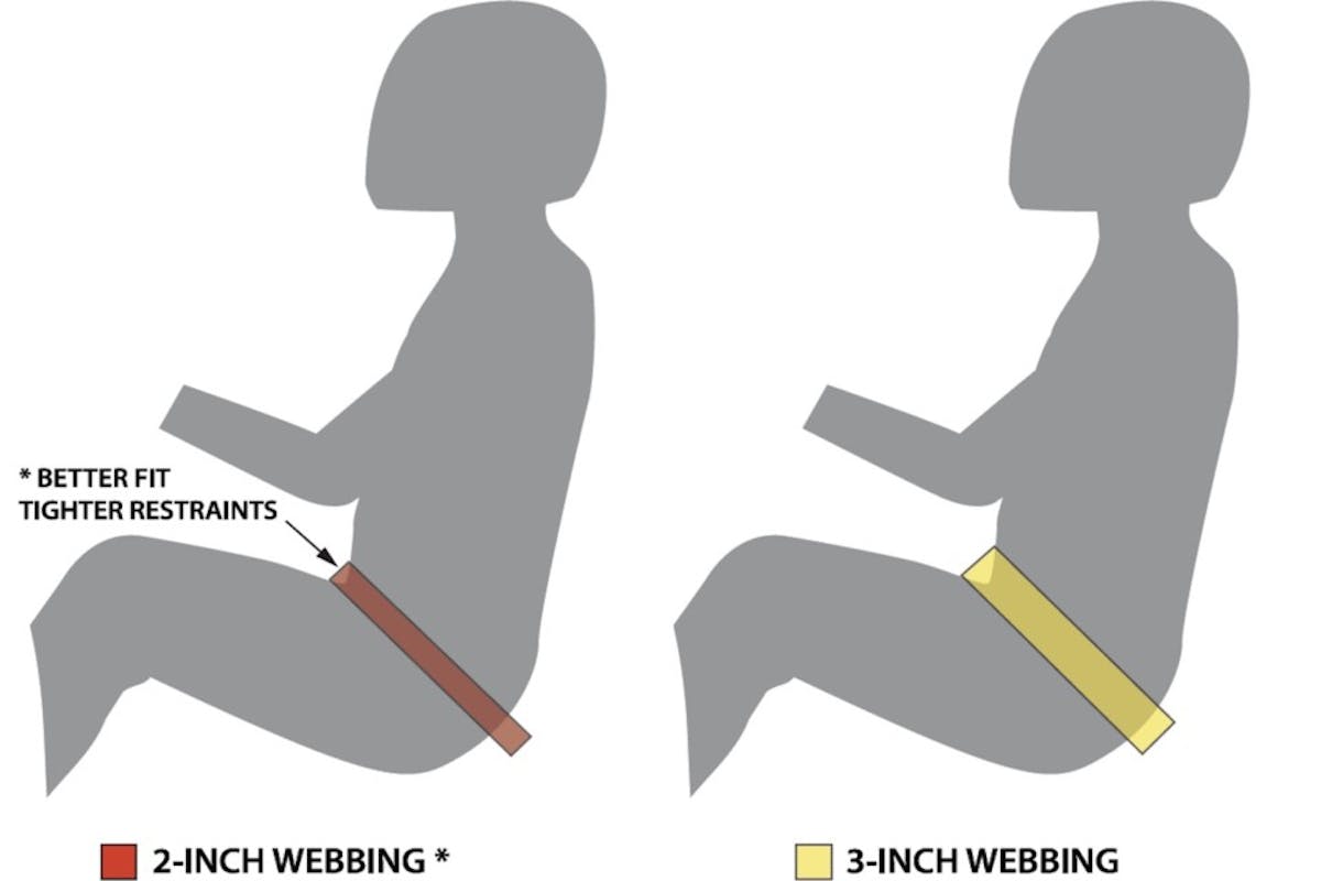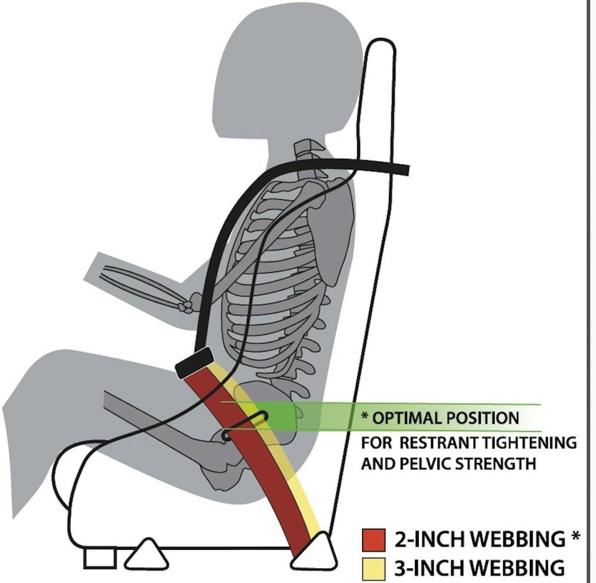 O’Connor claims there is another size aspect which plays a part as well. “The 3-inch restraints will sit on the top of your hip bone, the iliac crest. This makes it difficult to get the restraints as tight as they need to be. More importantly, these can move up, and in the event of a crash, they can get above the hip bones and into your abdomen causing internal injuries. The idea is to keep the belt low and down in the pocket all the time. Because the 2-inch belt sits in the pocket area better, there is less chance of internal damage due to the belt riding up.”