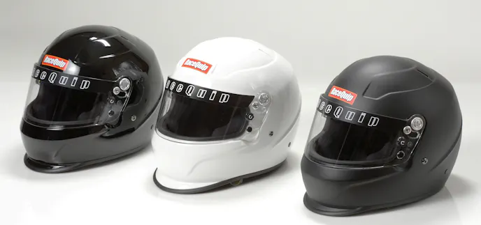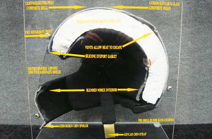 Patrick Utt, president of RaceQuip, explained how his helmets are built, “Helmet construction, from inside out, starts with a layer of fire retardant cloth covering a thin layer of soft foam against your head. This covers a 2-inch thick Expanded Polystyrene (EPS) dense foam insert. The EPS liner fits into an outer shell made from one of any various composite materials including fiberglass, Kevlar, and/or carbon fiber. The outer shell has a layer of gelcoat (or clear epoxy) that was sprayed into the mold to ensure the helmet has a good surface finish and releases from the mold more easily. Lastly, a layer of fire retardant paint covers the gelcoat layer.” RaceQuip prides itself for its affordable helmet designs and only builds SA rated helmets.