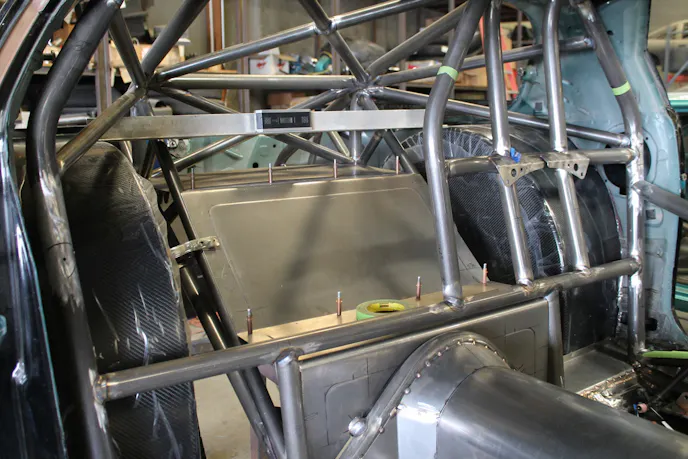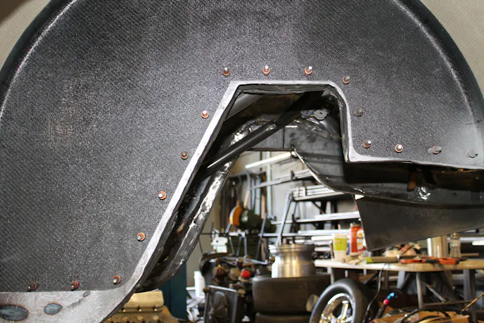The McAmis team mounts the rear edge of their tubs to what they call the rear tub filler, a carbon or aluminum panel that spans from the wheel tubs back to the rear bumper, using stainless steel button head screws. The front edge is then mounted to the upper 4-link crossmember pipe using rivets.