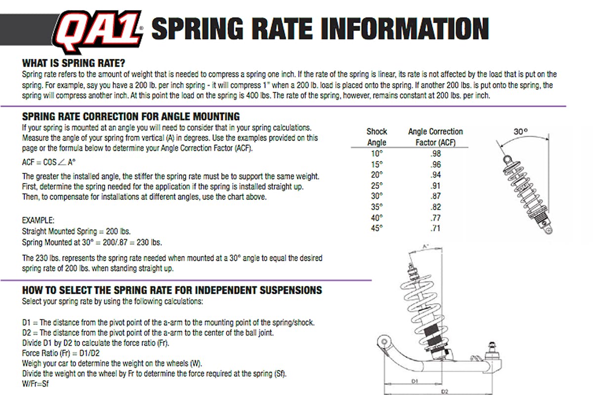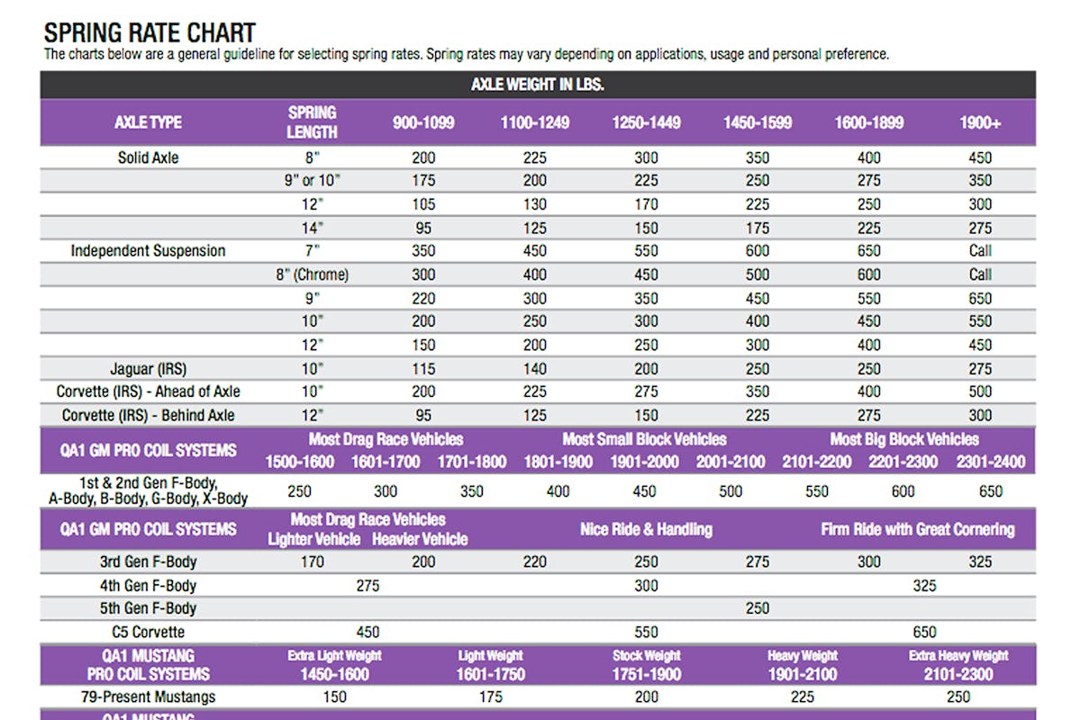 If you scale your front end weight and select one spring rate softer than our street car charts provide, you can verify the compression target after the spring is installed. With 30-35-percent of the spring compressed, there should be no surprise when the spring correctly does its job. – Steve Smith, QA1