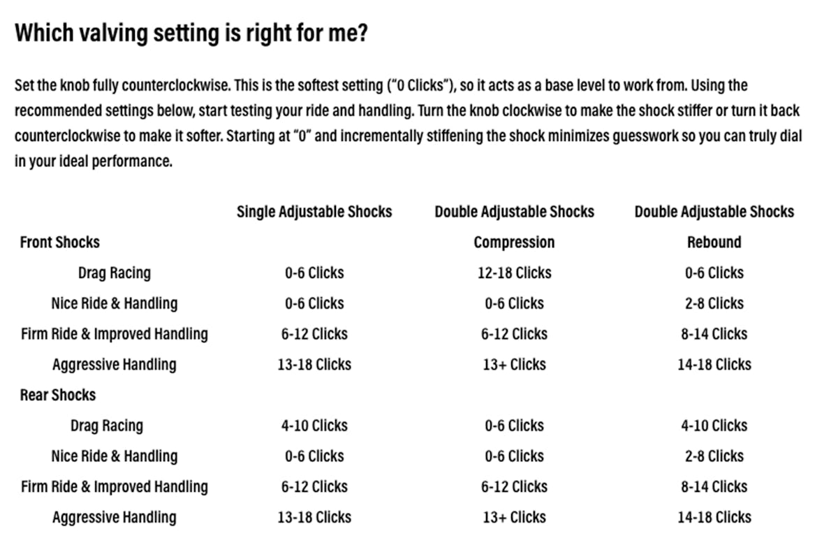 With 18 settings between soft and hard shock valving, the QA1 chart for single-adjustable front shocks advises beginning at 0 to 6 clicks clockwise from the softest or “-” position on your front shock adjusting knob.