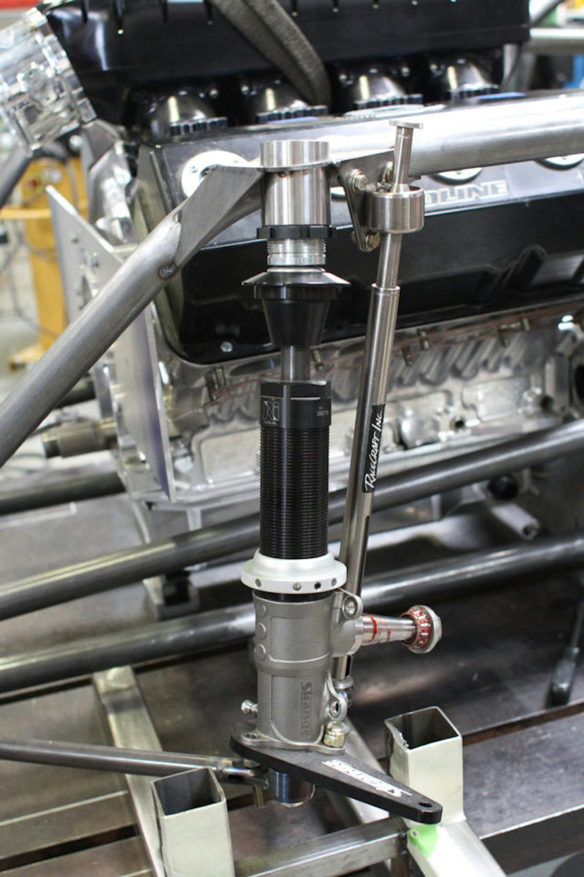 “If you go up there and the track is hot, there’s been an oildown and you’ve been sitting there for an hour and you need more weight transfer, you can just screw the mount out and raise the front of the car a turn or two and get the center of gravity up.” Rickie explains.