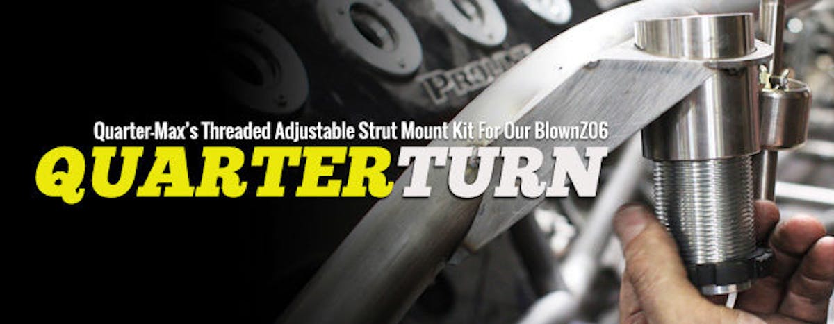 While much of the focus in drag racing suspension seems to rest on the rear of the car, what’s going on up front is every bit as important to producing a well-balanced, efficient chassis with solid driving characteristics. In an upcoming feature we’ll be taking an in-depth look at the JRi front strut that will be helping us to accomplish this on our Project BlownZ06 radial tire C7 Corvette, but before we can get to that, we first have to center in on the mechanisms for mounting the strut to our PMR Race Cars-built chassis. For that, we sourced one of Quarter-Max’s trick Threaded Adjustable Strut Mount kits.