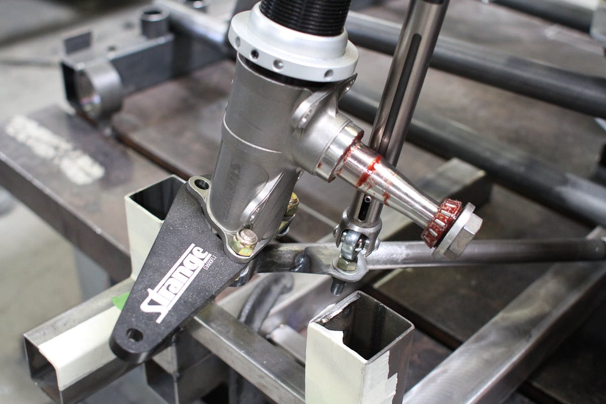 “As the strut goes through its travel, it can bind more, but with this, it’s going to pivot as it goes through its range of motion. With a welded bracket, you can only get it neutral in one spot, and once it begins to move it wants to either push the bottom strut in or out. So this allows the strut to be neutral and not bind, which makes it smoother and actually allows the strut to work easier,” Rickie explains.