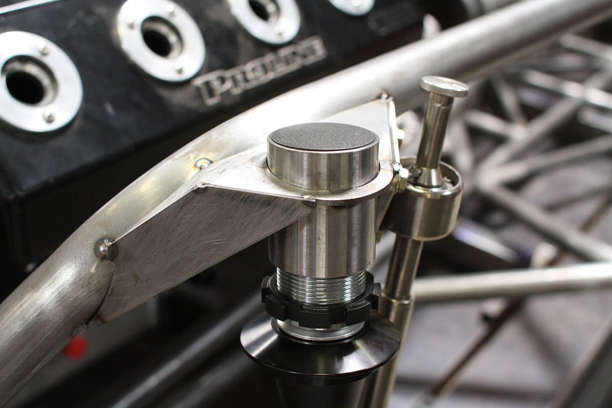 While much of the focus in drag racing suspension seems to rest on the rear of the car, what’s going on up front is every bit as important to producing a well-balanced, efficient chassis with solid driving characteristics. In an upcoming feature we’ll be taking an in-depth look at the JRi front strut that will be helping us to accomplish this on our Project BlownZ06 radial tire C7 Corvette, but before we can get to that, we first have to center in on the mechanisms for mounting the strut to our PMR Race Cars-built chassis. For that, we sourced one of Quarter-Max’s trick Threaded Adjustable Strut Mount kits.