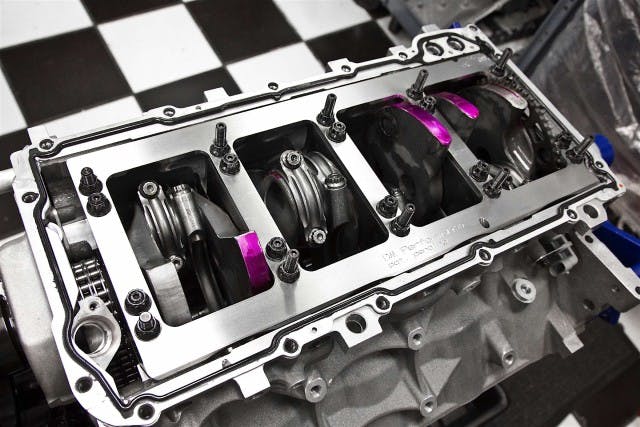 When the task at hand involves accelerating the crankshaft with as much ferocity as possible, anything that enables the crankshaft to rotate more freely can potentially reduce parasitic power loss. Although the LS7 block’s deep-skirt design provides excellent support of the main caps, the downside is that it isolates the crankcase into four separate sections. Consequently, crankcase pressure can create resistance against the piston as it travels down the bore. A vacuum pump offers an easy solution, but they’re banned by the NHRA on the COPO LS7.