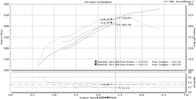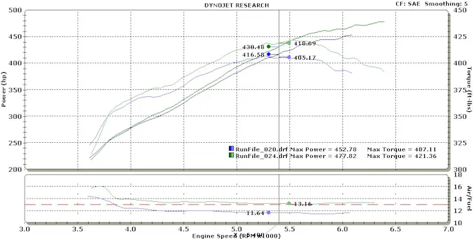In the end a peak gain of just over 60 horsepower and 18 ft-lbs of torque. This yielded a peak horsepower of 477.8 hp, and peak torque of 421.3 ft-lbs at the rear tires. We also gained roughly 1,100 rpm of useable engine speed. These gains represent an increase in horsepower of nearly 14% and a gain in RPM power band of nearly 20%, both are substantial. Both gains could translate into quicker times on the track or even open up gearing and tire options for the street or the strip. Also, our air fuel ratios were right on target for our naturally aspirated setup. With the original 850 carburetor we were actually running a little bit too rich at 11.74, but the Ultra HP 850 we had leaned out to 13.16. This is a difference of less than 1.5 on the A/F ratio still well within the safe zone on this engine and obviously worth the extra power.