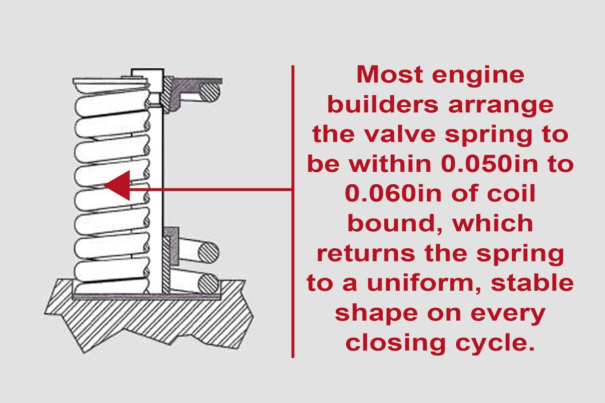 Related to maximum valve lift, when a valve is fully opened—most engine builders set up the valve spring to be just short of coil bind, which returns the spring to a uniform, stable shape on every closing cycle. When the spring reaches maximum compression, only a few coils in the middle have a small gap, within .050- to .060-inch.