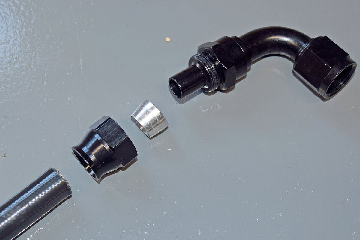 The crimped fittings also offer the benefit of a more compact fitting compared to the reusable fittings. “It may not be a huge issue in many applications,” says McLellan, “but it is a benefactor in dry sump oil systems and some tight spots in fuel plumbing.”