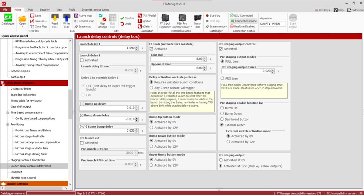 Pre-Staging Output Control, more commonly known as starting line enhancer, is built into the FuelTech system. A starting line enhancer helps control RPM during the staging process by activating an inline throttle stop that keeps the RPM low until a programable preset timer expires and then allows full throttle to be reached. Along with dedicated throttle-stop controls, and the dial board feature allows racers to automatically display their dial-in.