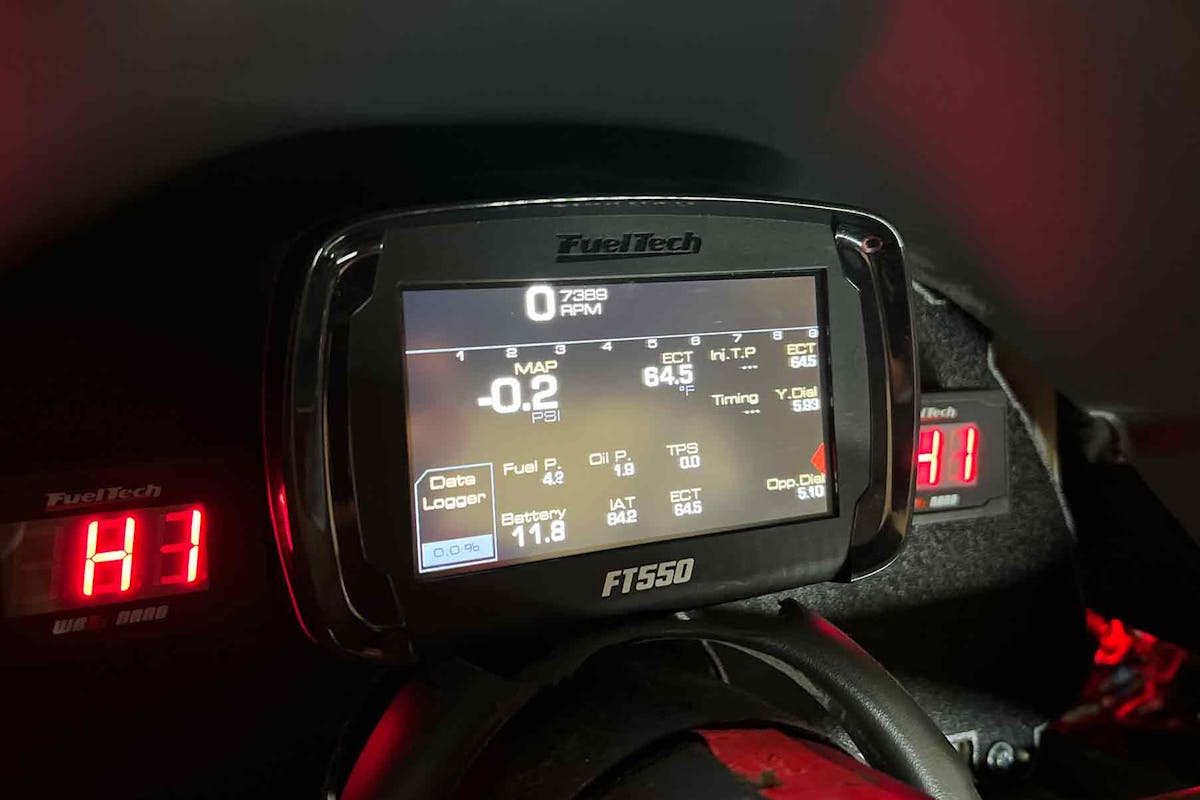 “Any of the FuelTech ECUs can store up to three totally different tuneups in the unit, and are user-selectable, either through the touchscreen or an external button,” says FuelTech’s Jacob Gaddis. “This gives the ability to anticipate track conditions and make a tuneup change while waiting in the lanes without getting out a laptop. That can also make testing day progress much faster. If the car spins, just back up, change the tune, and go again.”