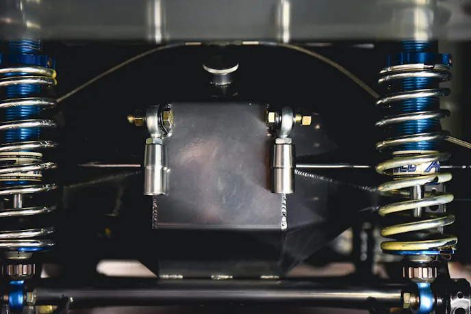 Once you have all your X-member bars complete, tack them into place — along with your rod ends and the wheel brackets — and bolt them up to the housing. Here, we used a tie-down strap from the bumper to raise the bars up into position, checked to ensure they were level, and then slipped the upper bars onto the housing brackets. To get our top bar length, we eyeballed them on the upper rod end, marked it, and made our cut. One important note here is that you will always want some adjustment both up and down, so position the rod on the upper bar and leave yourself half of the threads exposed at both ends; this will change the length of your top bar, so ensure you’re doing this step first.