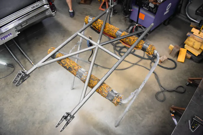 From there, with a tape measure, we carefully marked out all of our positions for the X-member to land and tack-welded the crossbar into place. We then headed over to the tube notcher, and with the appropriate angles dialed in, made our cuts, being careful to measure twice, cut once, and to trim it a little short and keep checking our work. As you lay each straight section of tube up with its correlating tube in the “X,” run a piece of string the length of the two bars to be certain they line up.