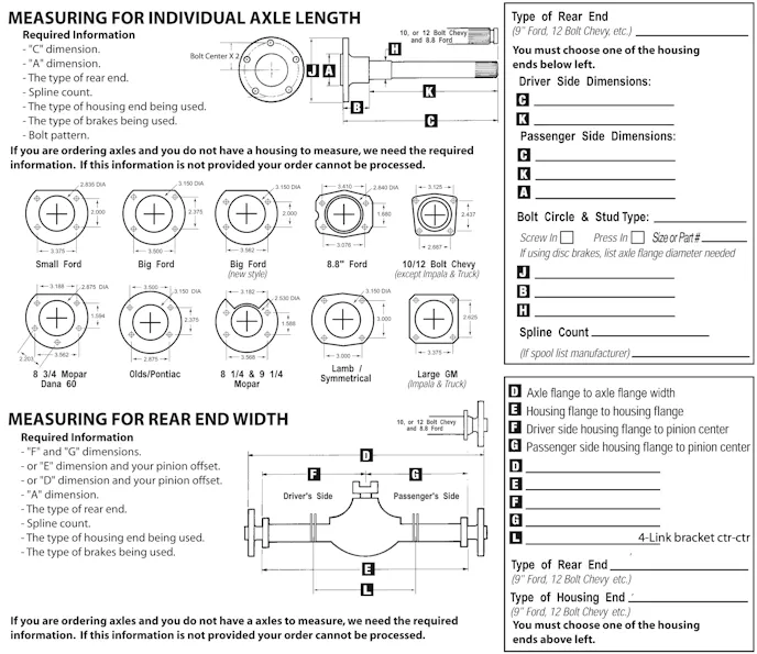 “We know some people aren’t confident in the measuring or the measurements they need to supply. There’s more than one way to skin a cat when it comes to getting those measurements. The easiest for a lot of guys, if you’re going to narrow the housing and you know what size tire you want on the back of it, is to go ahead and remove the rearend, put the tires and wheels under the car, and measure back-of-wheel to back-of-wheel, and give us that dimension. That will tell us where the housing needs to be, and we can figure backwards from that with a few more bits of information.”