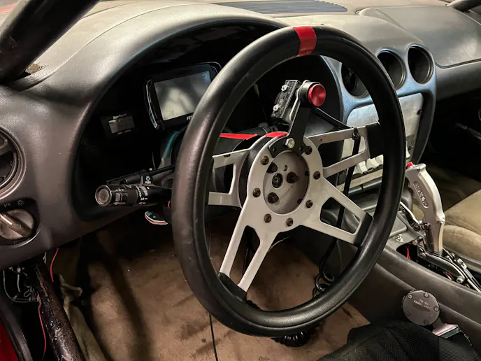 Once we got a proper roll cage put in the car, the next step was to replace the factory steering column with not only a lighter, more purpose-built part for racing, but something that would make climbing in and out of the car much easier. An added bonus — and something people often don’t think about it — is that a quick disconnect hub adds security to your vehicle, because if you’re using your vehicle as your transportation, you can simply take the steering wheel inside with you and leave a would-be thief with no means to steer the car away (not applicable to a car with hard-wired buttons on the wheel, of course).