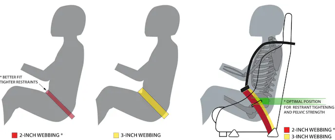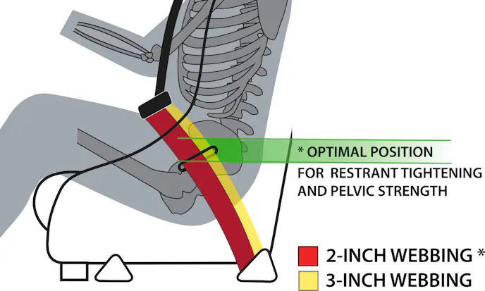 Likewise, you also don’t want the webbing coming over the top of the hip bone, known as the iliac crest — in a forward event — the webbing can ride up over the hip bone and get into the abdomen, leading to internal injuries. O’Connor says you never want to be restrained around the stomach; the lap belt should always be as low as possible, and as tight as possible, and a 2-inch belt accomplishes both much better than 3-inch.