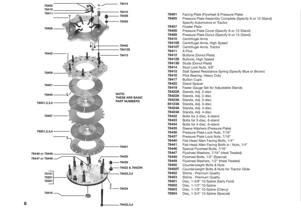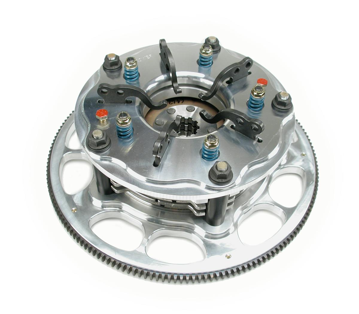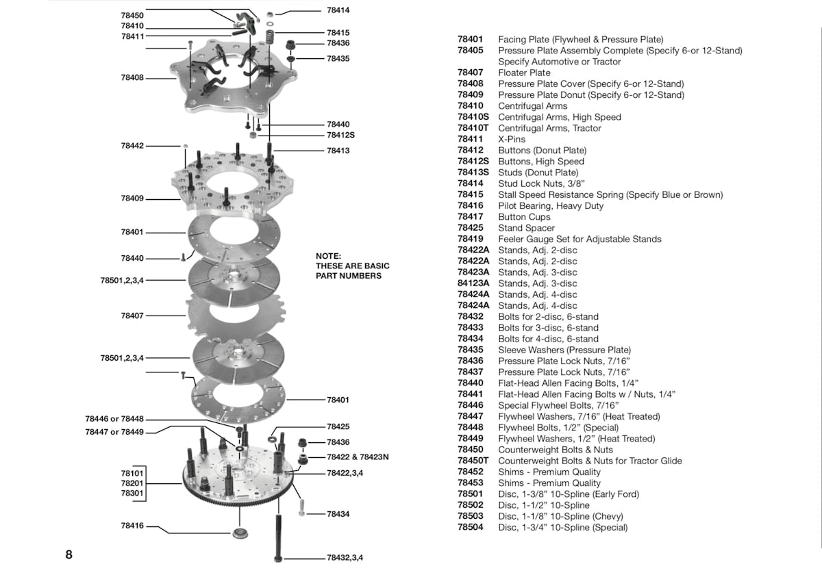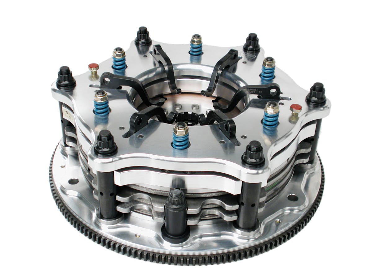 Like a pedal-operated clutch, the Crowerglide has a flywheel with six stands that hold in place a series of plates and discs: first is the Facing Plate, followed by a disc, a floater plate, a second disc, a second Facing Plate, the Pressure Plate Donut, and the Pressure Plate cover (in that order in a two-disc configuration).